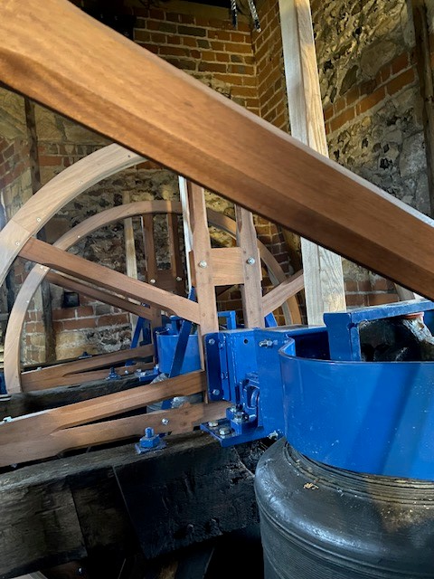 Thankfully by early 2023 enough money had been raised to fully fund the project, Whites had completed the work and the bells were ready to be rehung. A couple of weeks before the rehanging carpenters and bellhangers spent a few days in the bell chamber preparing the fixtures and fittings ready for the bells to be fitted. On Thursday 23rd March the bells triumphantly were transported back to the village by Jim Bracey who once again had volunteered his transport. They were met outside the lytch gate by lads from PJS Agricultural Services and off loaded by lads from the Manor, it was then a reverse of the removal with plywood covering the gravel on the church path to allow the bells to be wheeled back into the church. They were then displayed over the weekend of the 25th & 26th March to allow those interested to view the work that had been carried out. Display boards described the work, how the treble was welded, what the new wheels were made off, how the tuning had been carried out and lots more. On Sunday 26th the bells were blessed during the 9am service by the Venerable Christine Allsopp before work commenced to rehang them in the tower on Monday 27th.