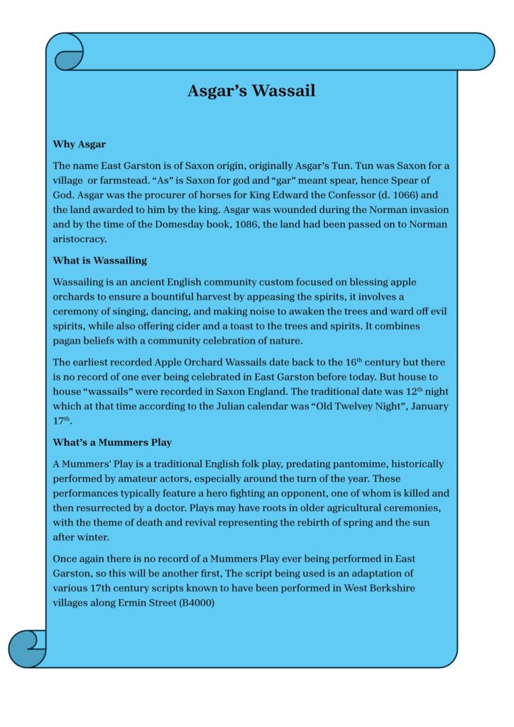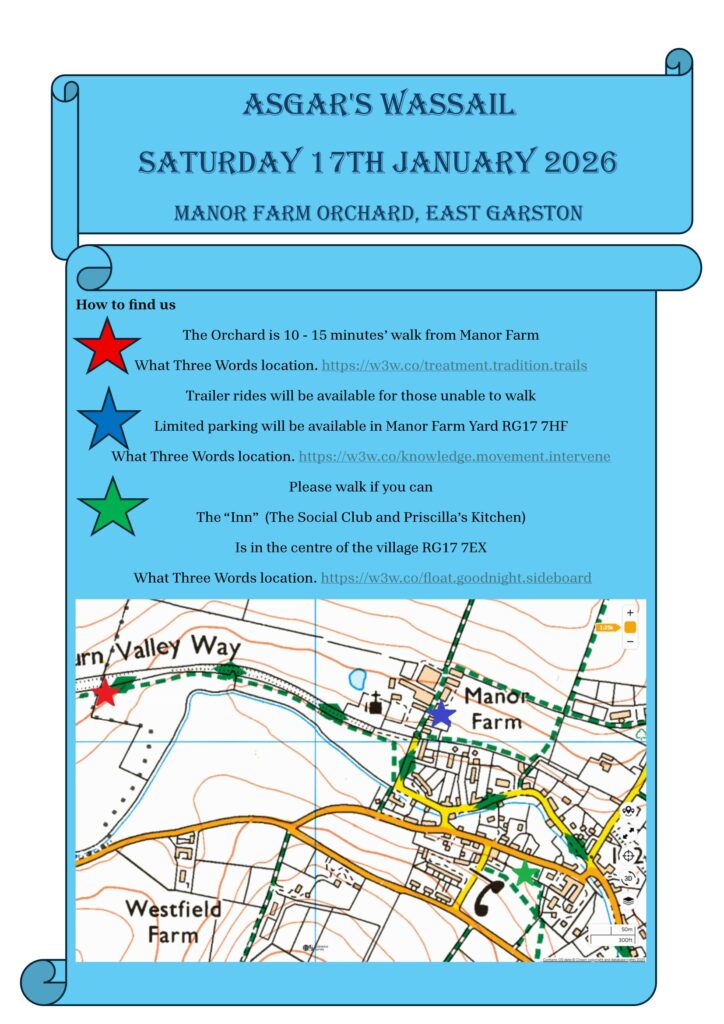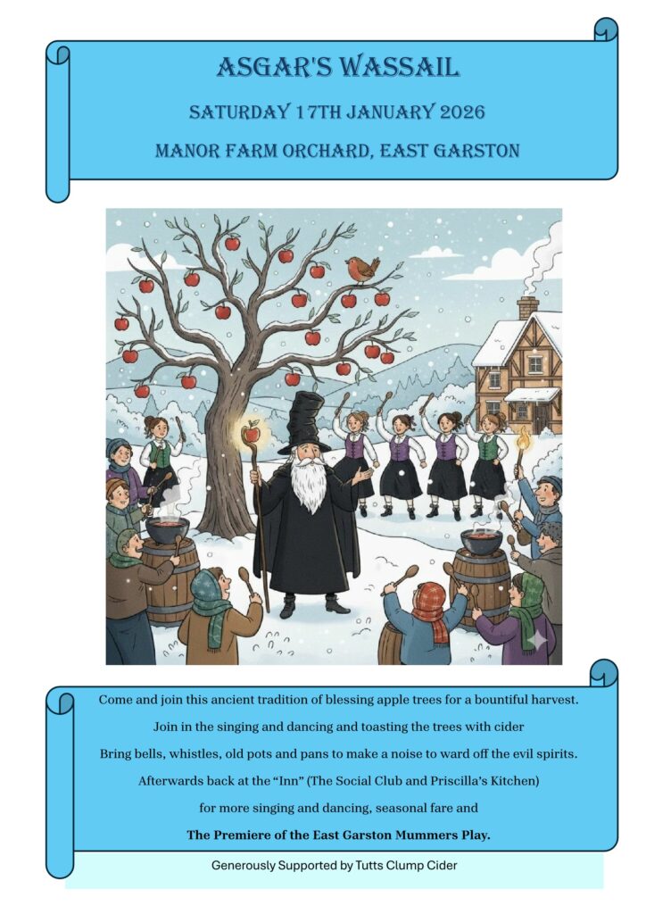 It will be held in Manor Farm Orchard followed by more merriment at the Social Club and Priscilla’s Kitchen and with the premiere of the East Garston Mummers play, another ancient tradition not seen in the village for hundreds of years.